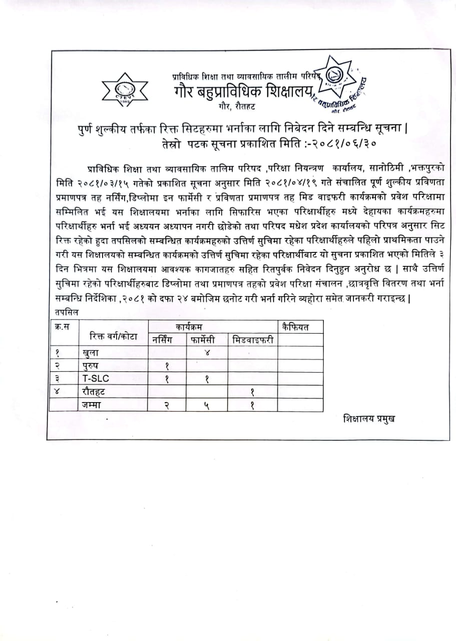 पुर्ण शुल्कीय तर्फका रिक्त सिटहरुमा भर्नाका लागि निबेदन दिने सम्बन्धि सूचना |